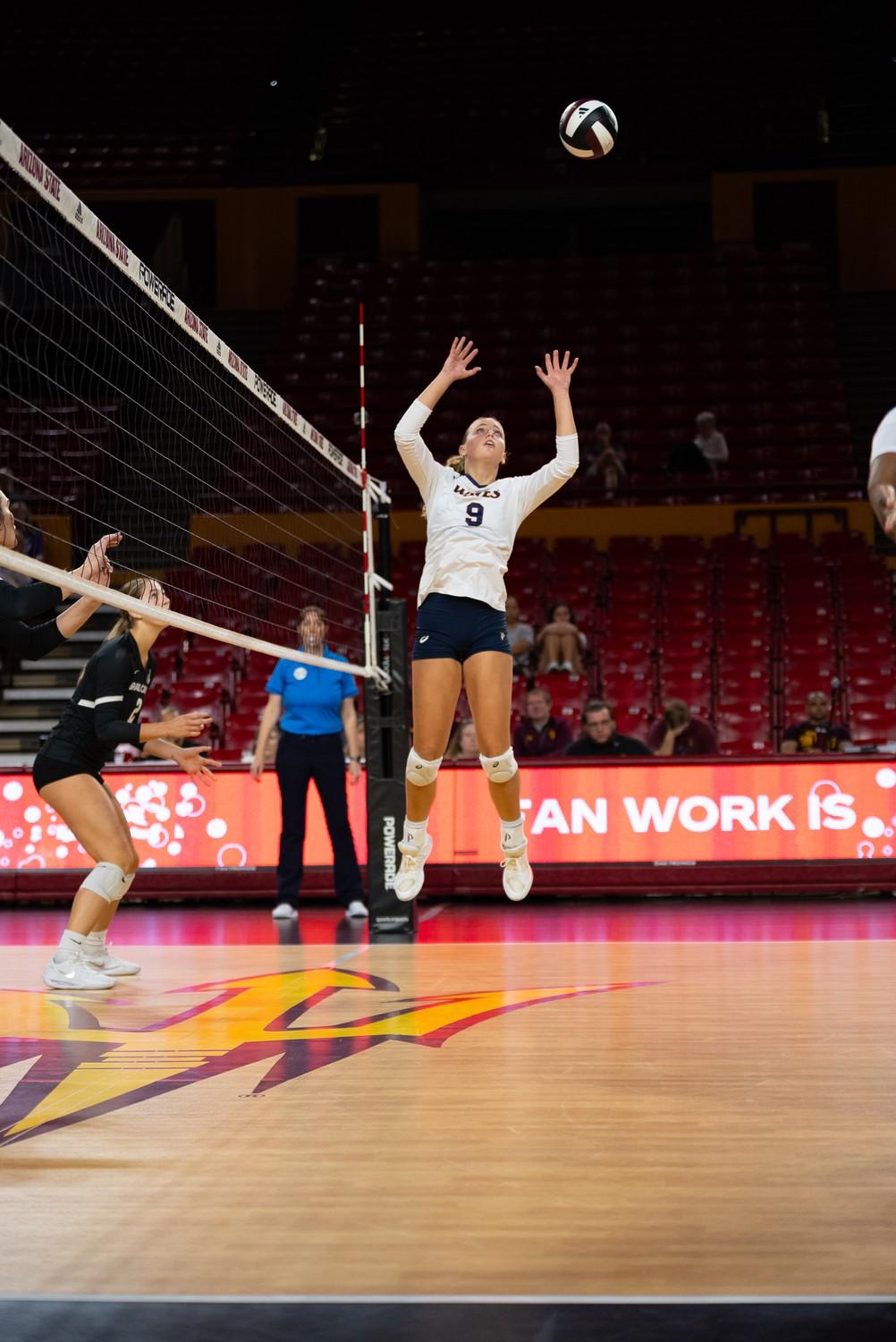 Freshman setter Tristen Raymond sets up an attack against Arizona State University on Sept. 19 at the Desert Financial Arena. Raymond won West Coast Conference Setter of the Week twice this season Sept. 22 and Oct. 20.