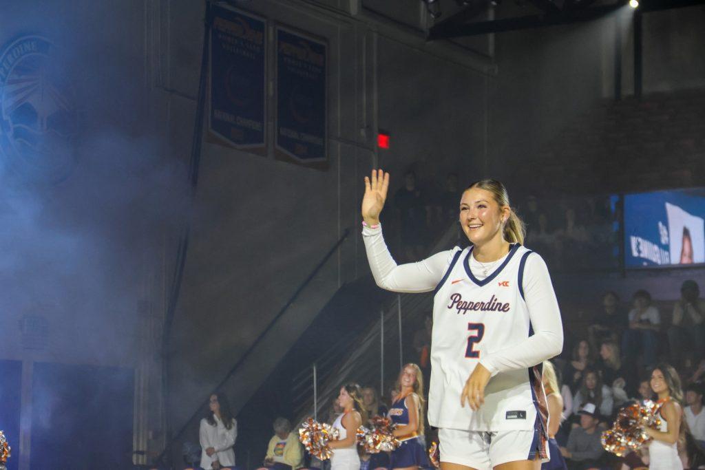 Sophomore guard Elli Guiney waves to the crowd at Blue and Orange Madness in Firestone Fieldhouse on Oct. 3. Guiney said her team is constantly learning through every win and loss.