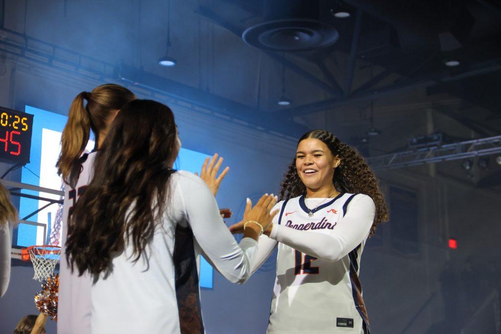 Junior forward Shorna Preston high-fives two teammates at Blue and Orange Madness in Firestone Fieldhouse on Oct. 3. Preston has recorded six double-doubles on the season so far. Photos by Melissa Houston