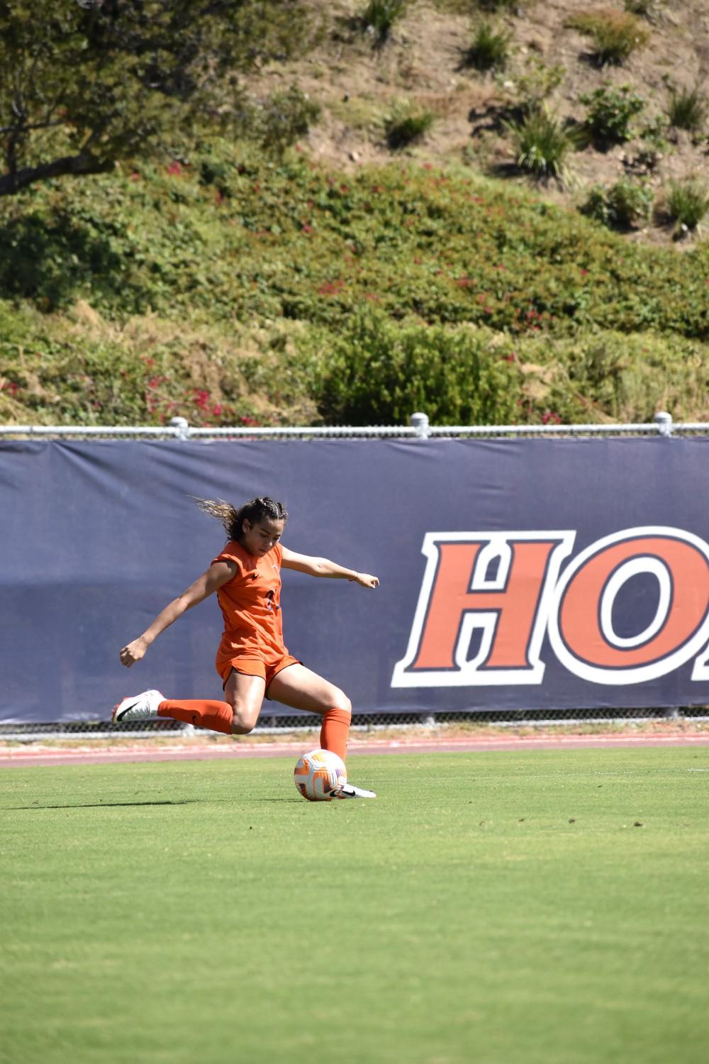 Junior forward Julia Quinonez shoots for the goal Oct. 7 2023 at Tari Frahm Rokus Field. Quinonez had one shot on goal and four shot attempts against the Gaels on Oct. 25.